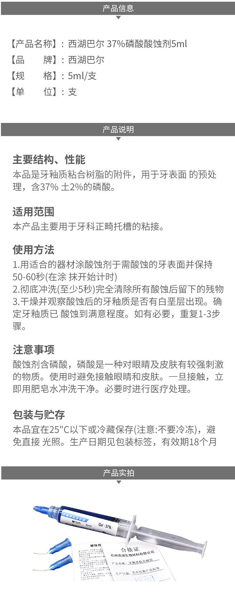 西湖巴尔 37%磷酸酸蚀剂5ml