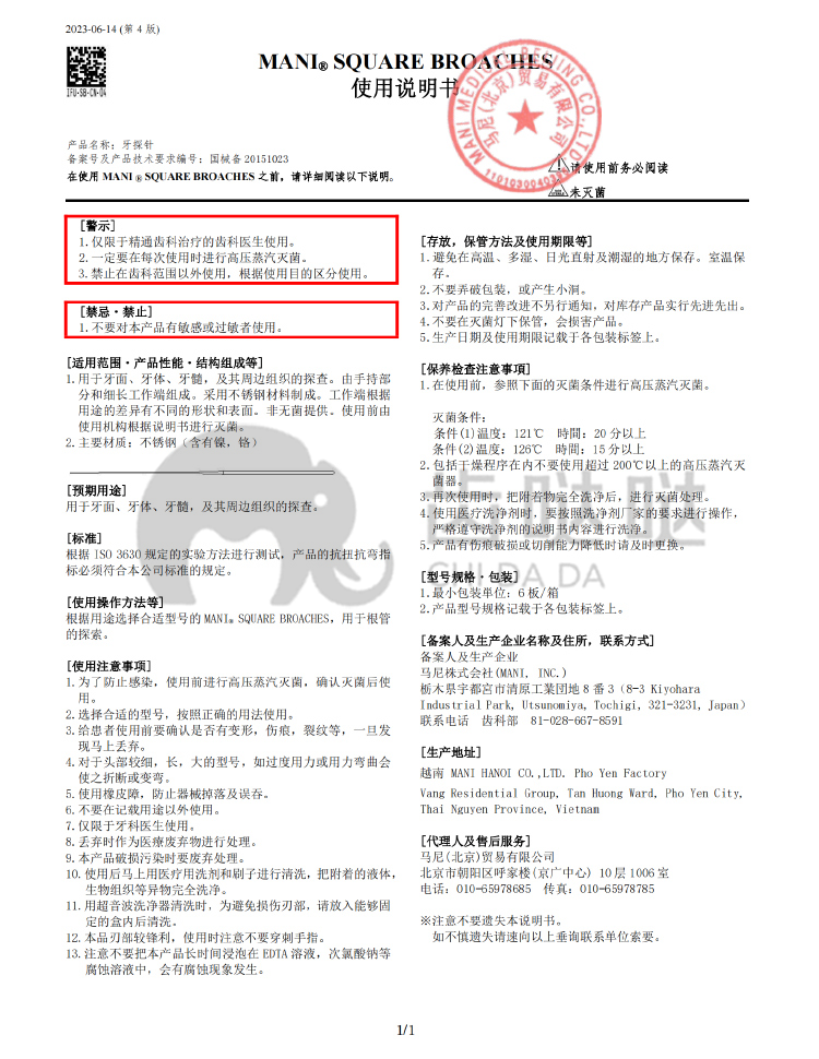 马尼 MANI SQUARE BROACHES 光滑髓针 牙探针 12支/板 52MM