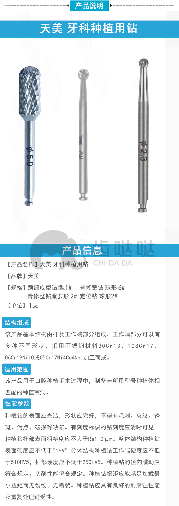 天天/天美 牙科种植用钻/骨修整钻 菠萝钻