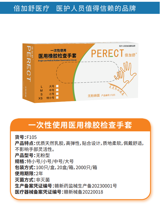 倍加舒 一次性使用医用橡胶检查手套 无粉麻面100只/盒F105