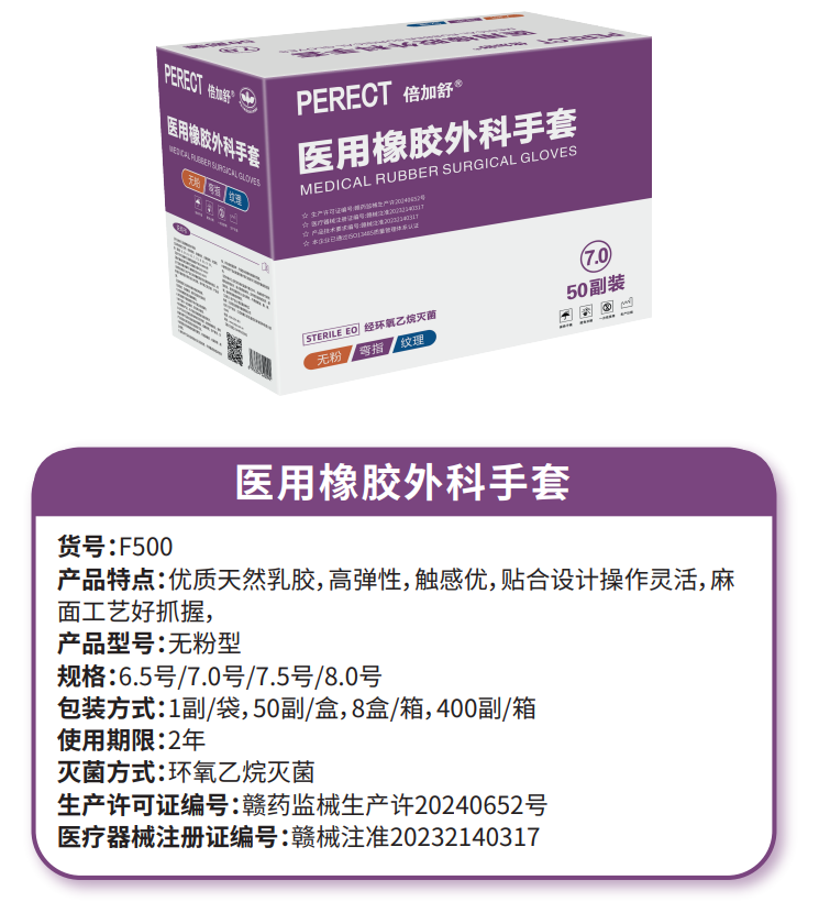 倍加舒 医用橡胶外科手套 无粉纹理弯指(50副/盒)