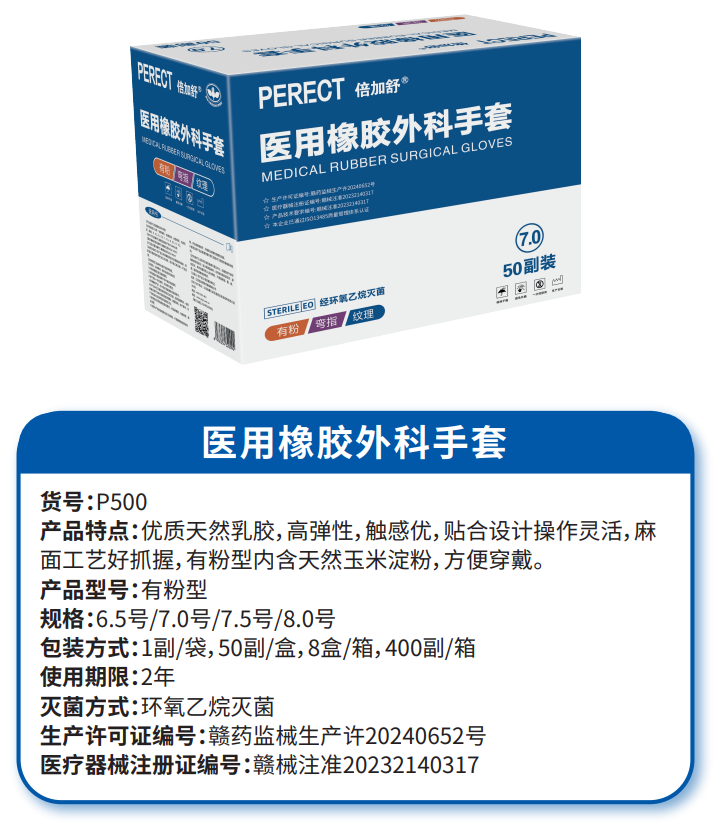倍加舒 医用橡胶外科手套 有粉纹理弯指(50副/盒)