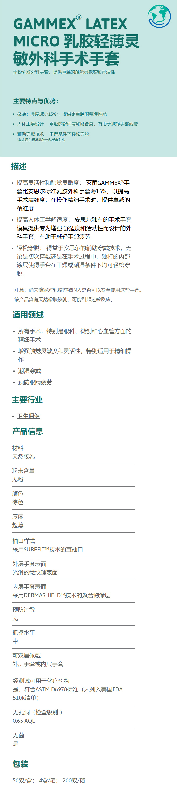 安思尔GAMMEX Latex Micro一次性使用灭菌橡胶外科手套(无粉棕色麻面)50付/盒