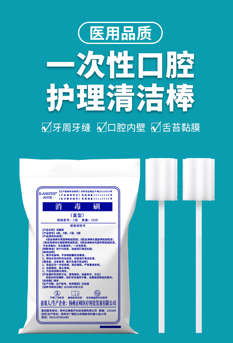邦可慧 消毒刷/一次性口腔护理医用海棉棒/口腔清洁棒 (直型)独立包装